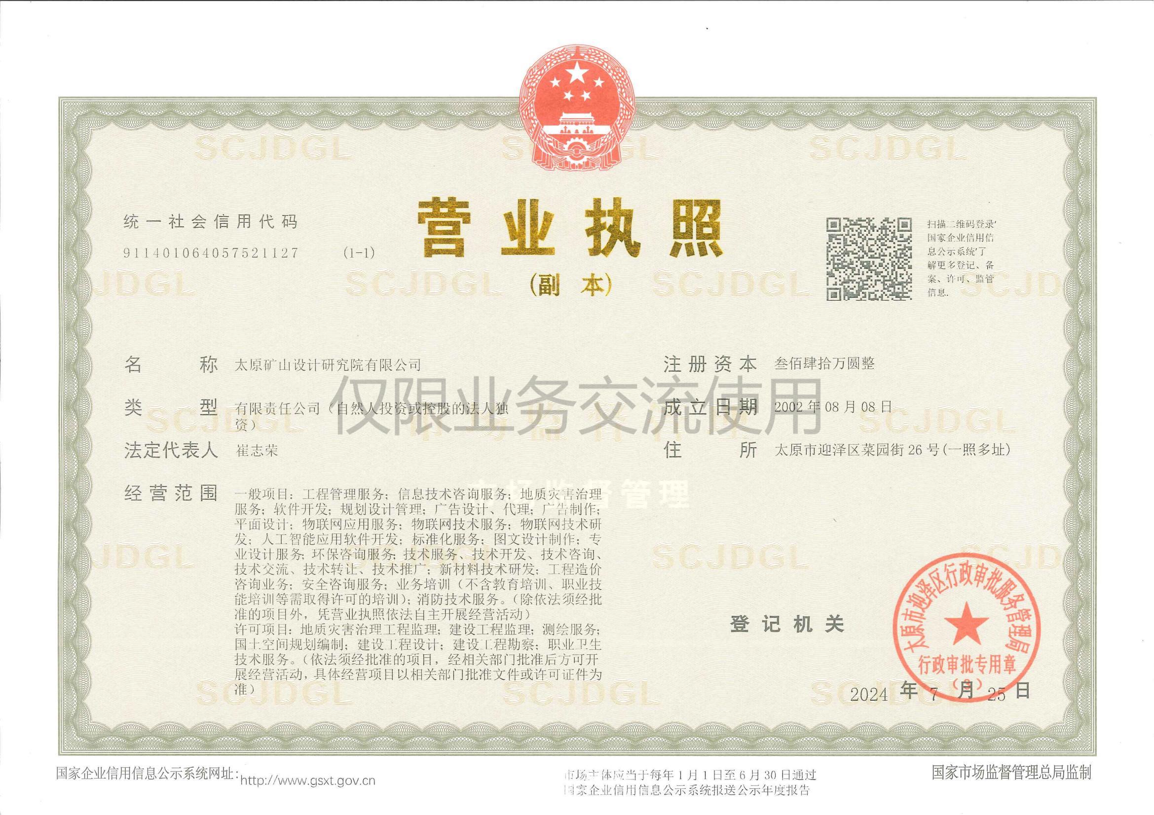 公司主要從事礦山采選尾工程設計、智能化及自動化礦山、建設綠色礦山、工程技術咨詢、規(guī)劃設計管理、施工勞務分包、土地規(guī)劃、地質災害治理服務、安全生產(chǎn)技術服務、軟件開發(fā)及測繪服務;煤礦、非煤礦山設計;煤礦、非煤礦山、危險化學品安全評價(業(yè)務范圍:煤炭開采業(yè);金屬、非金屬及其他礦采選業(yè);石油加工業(yè),化學原料、化學品及醫(yī)藥制造業(yè));非煤礦山、冶金等工商貿企業(yè)、危險化學品從業(yè)單位安全生產(chǎn)標準化評審;公共場所衛(wèi)生、生活飲用水、公共場所集中中央空調通風系統(tǒng)的檢驗、檢測、評價;職業(yè)健康檢測檢驗;建設項目職業(yè)病危害評價、職業(yè)危害因素檢測與評價;安責險技術服務;業(yè)務培訓等工作。